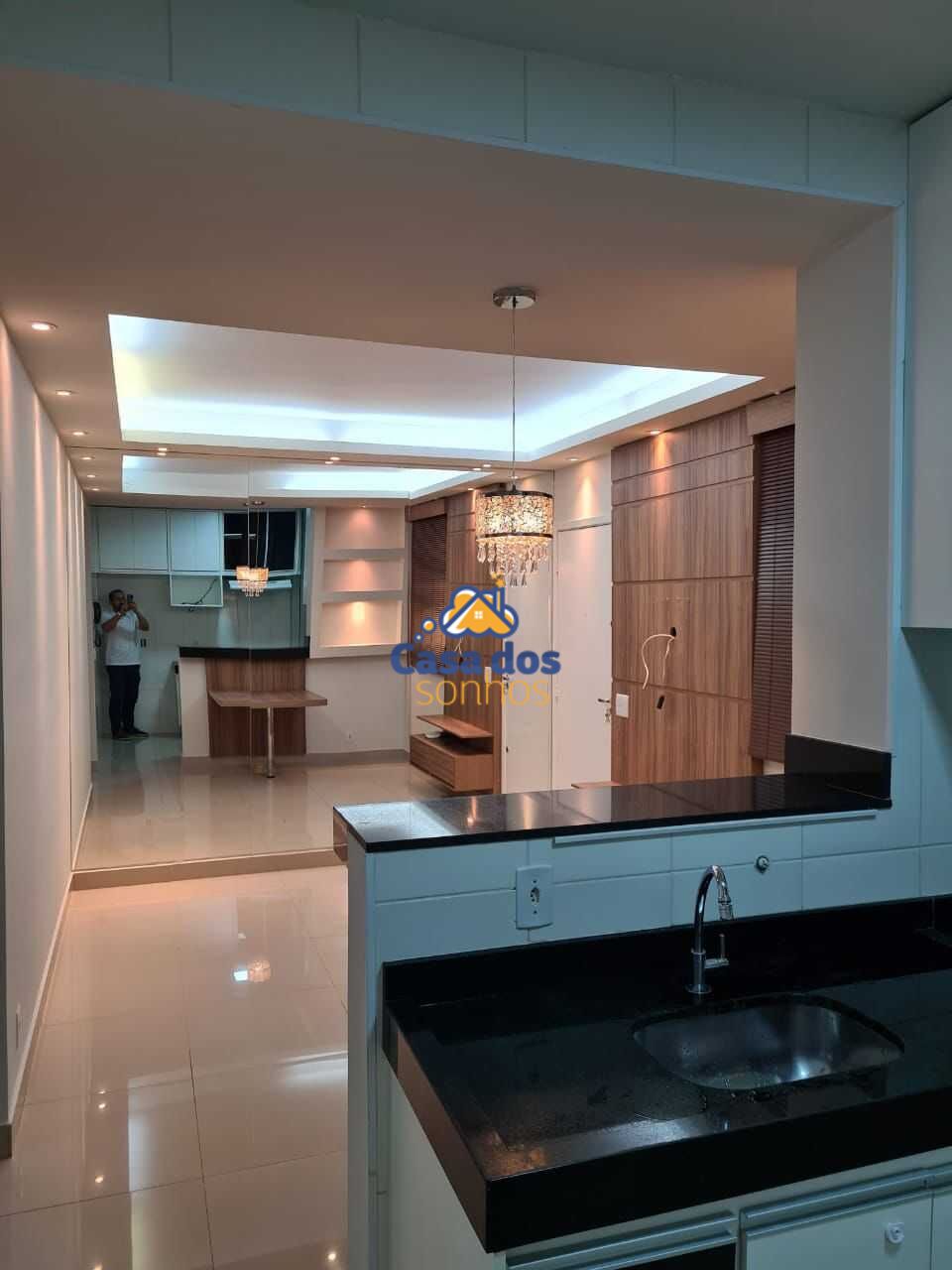 Cozinha com pia em granito, armários planejados e mesa fixa