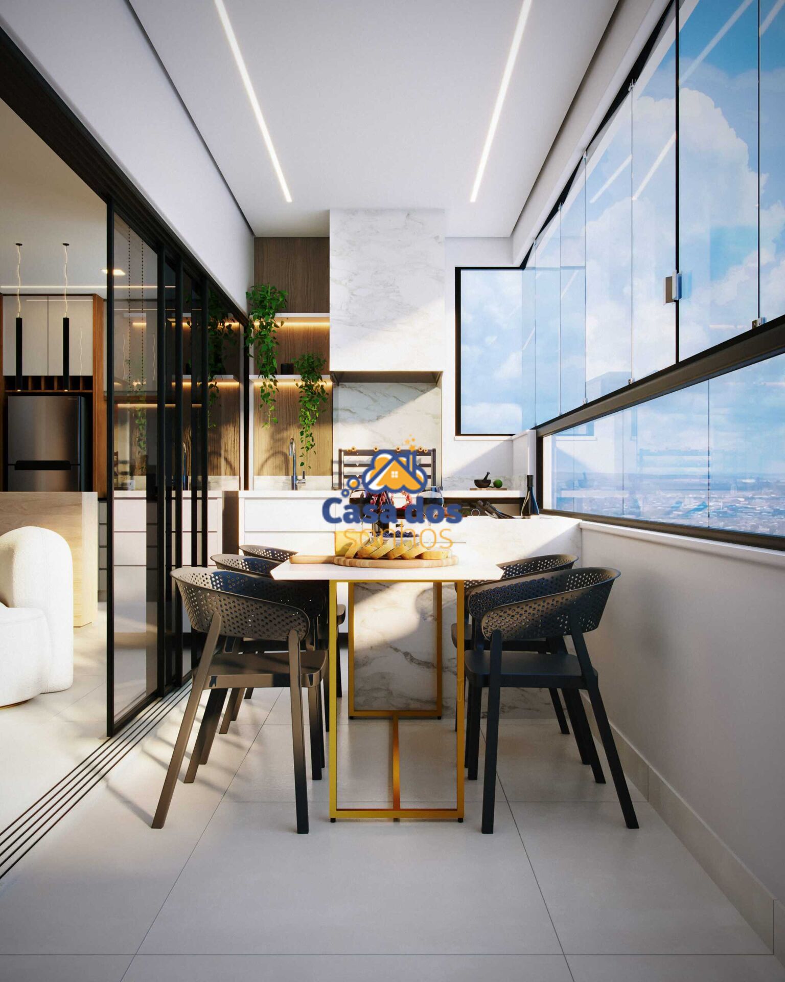 Sala ampla em dois ambientes e sacada gourmet com churrasqueira