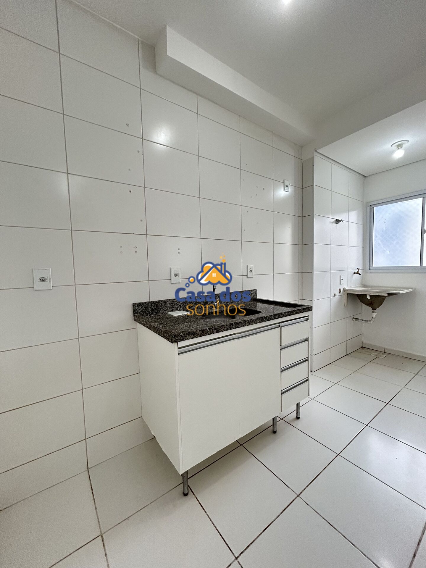 Cozinha com pia em granito e armários embaixo