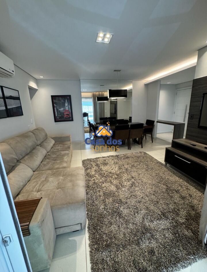 Sala ampla em dois ambientes, mesa de jantar, sofá, painel, TV