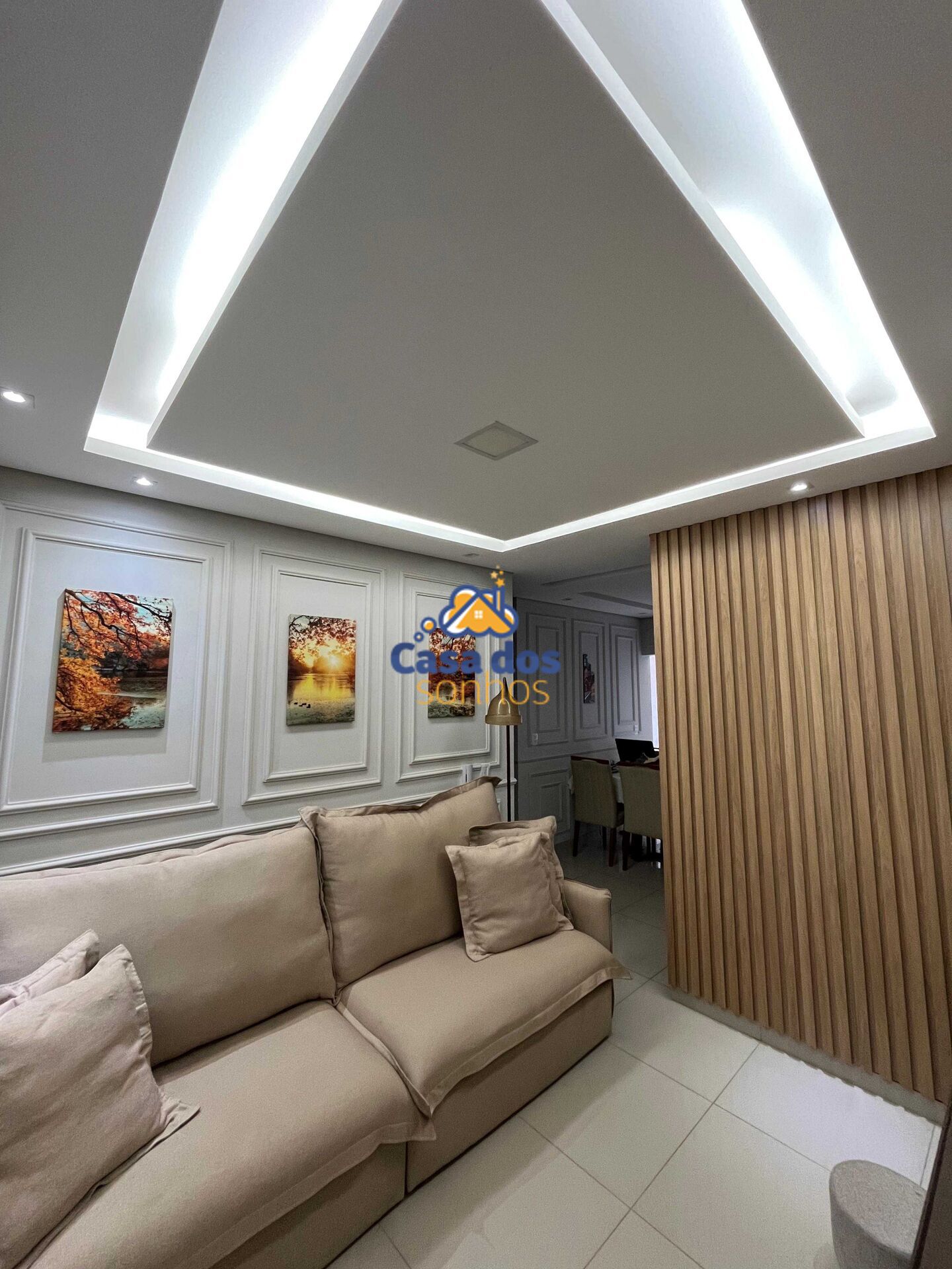 Sala ampla com parede em 3D, painel