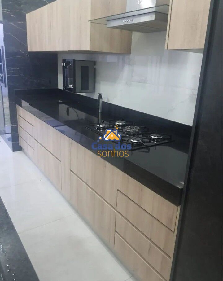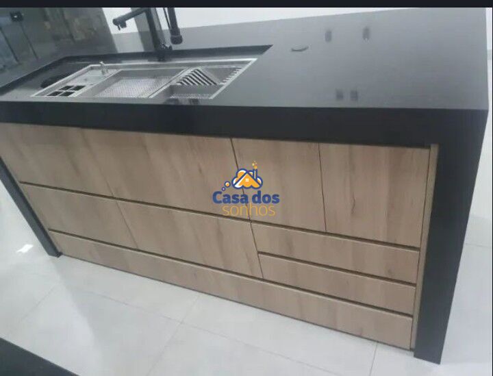 Cozinha com pia, bancada e ilha em granito, armários planejados, Cooktop, coifa com exaustor, churrasqueira em porcelanato