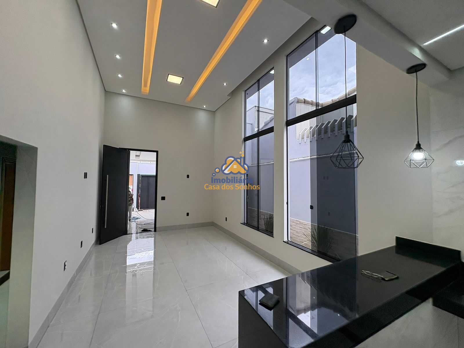Sala ampla em dois ambientes, pé direito duplo