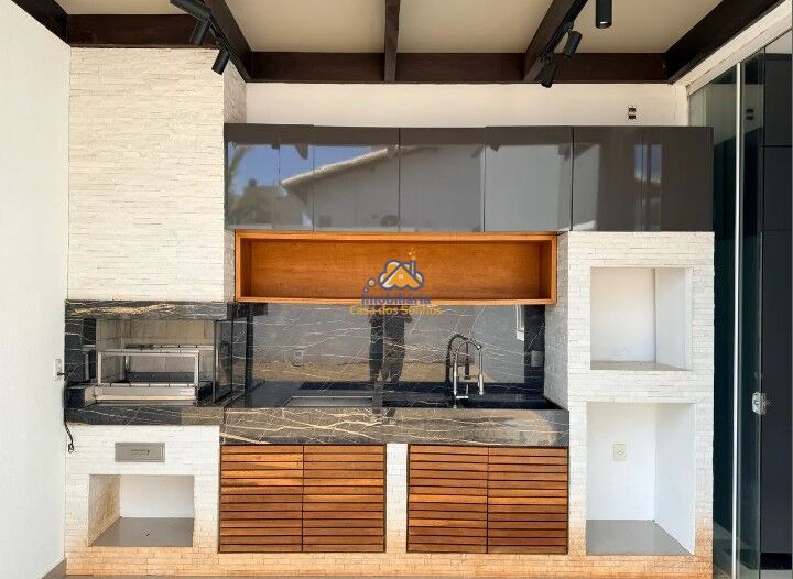 Varanda gourmet com churrasqueira, armários e um quarto