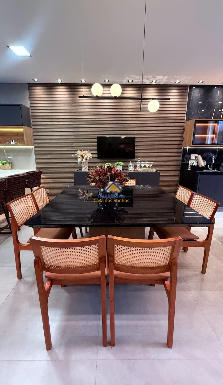 Cozinha com pia e bancada em granito, mesa em quartzo branco, geladeira inversor, adega, forno e microondas, armários planejados, mesa de jantar para 8 pessoas