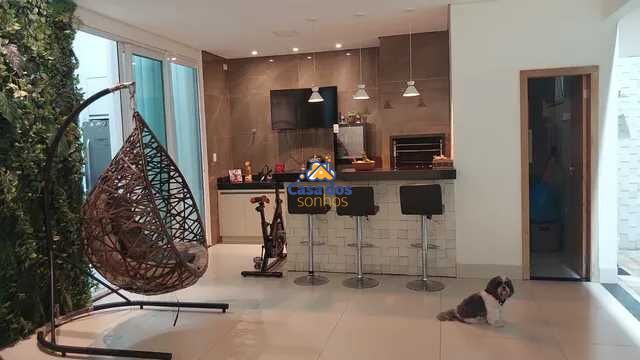 Sala ampla em dois ambientes integrando a cozinha com pé direito duplo, painel de TV