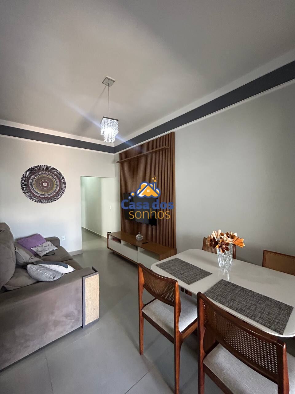 Sala ampla em dois ambientes, painel ripado