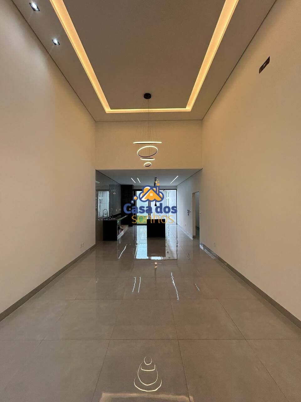 Sala ampla em dois ambientes, pé direito de 4,5 metros