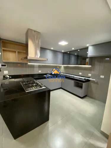 Cozinha com pia, bancada e ilha em granito, Cooktop e forno Eletrolux e coifa, armários planejados