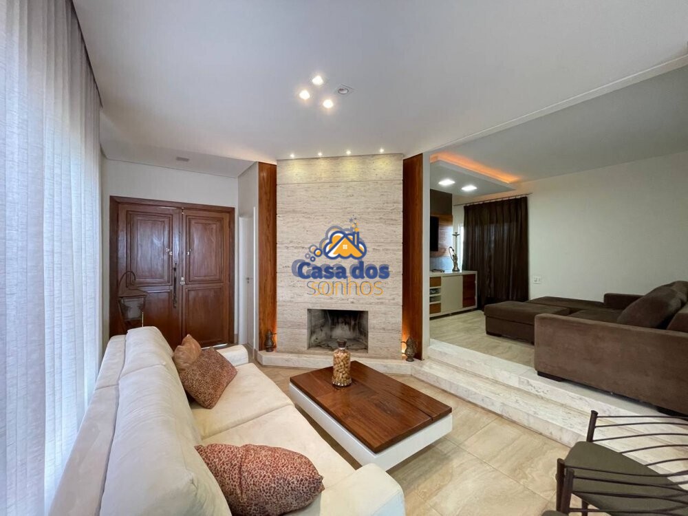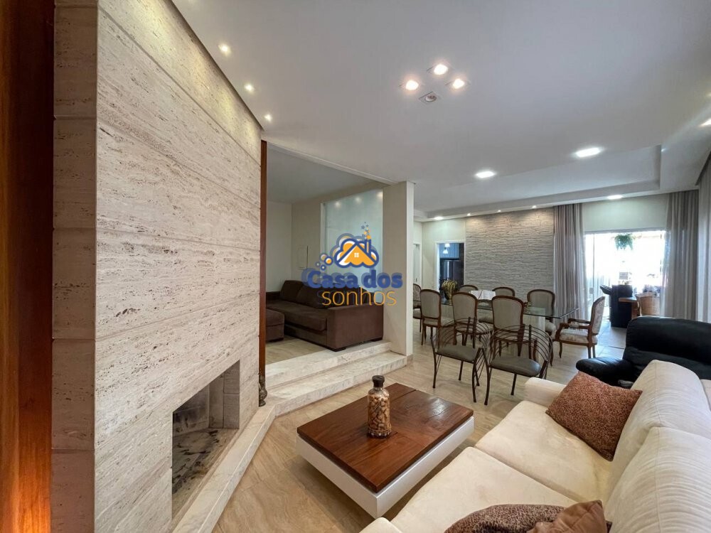 Sala em 3 ambientes,sala de estar com lareira, TV e jantar com parede espelhada