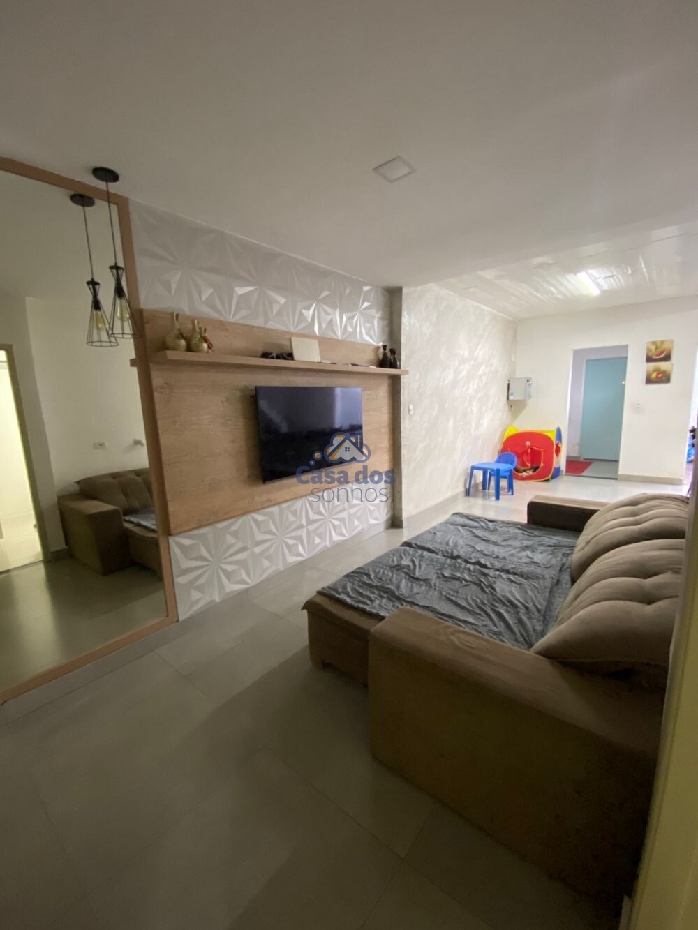 Sala em dois ambientes integrando com a cozinha,uma parede com detalhes em gesso e espelho