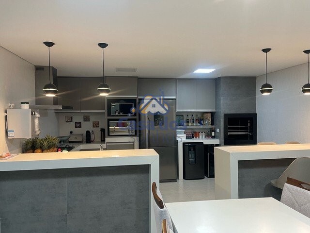 Cozinha com pia e bancada em Granito, armários,integrando com a copa e churrasqueira